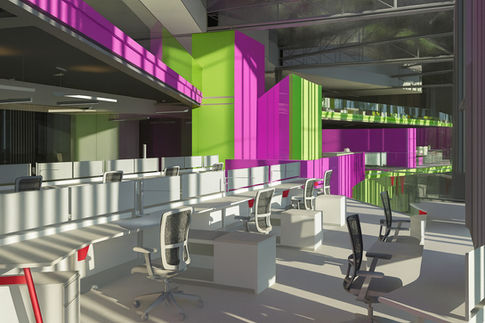 The office area is composed of two levels: the first one house and space for events such as an auditorium with a capacity of 220 people, a cafeteria, and a showroom, as well as spaces for employees such as the casino and locker area.